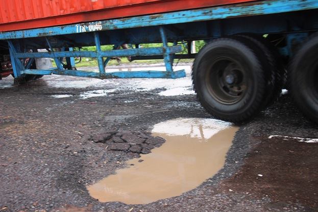 Thậm chí, tại nhiều đoạn xuất hiện những vết hư hỏng rất lớn giữa đường, tiềm ẩn nguy cơ gây tai nạ n giao thông. Nhằm hạn chế tai nạn, người dân địa phương dùng đá lấp lại những ổ gà, ổ voi. Đồng thời, đặt những chướng ngại vật để cảnh báo đường hỏng cho người đi đường biết.